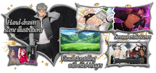 Dive deeper into Grey’s journey with stunning cutscene illustrations that capture emotional turning points, playful chaos, and unforgettable moments with Haelo and Horne. Each scene is hand- drawn and fully rendered, tailored to highlight every line of dialogue with expressive visuals that enrich the storytelling. Stylish mini-illustrations also bring important moments to life, whether they're romantic, haunting, or hilariously awkward. All artwork is stored in a custom-made game gallery, so you can revisit your favorite scenes anytime!