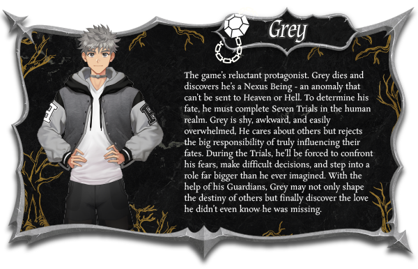 Seven Nexus is a gay visual novel about Grey, a man who dies a sudden death and learns he’s an anomaly - a Nexus Being. No one knows how he lived or died, and as such, he can’t be judged by Purgatory. He doesn’t belong in either Heaven or Hell.