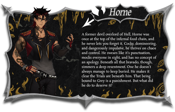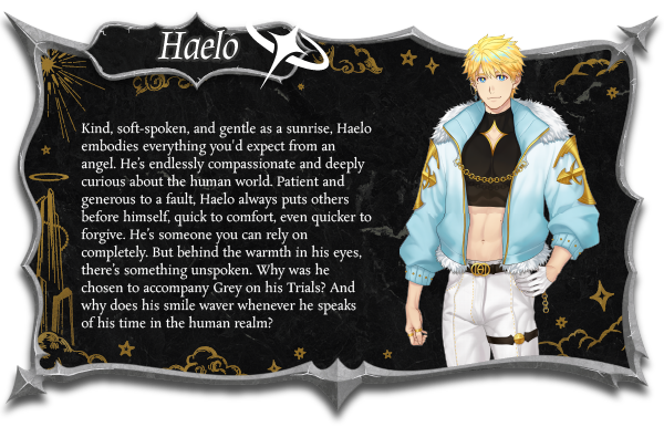 As Grey navigates the Seven Trials, he’ll have the chance to grow closer, and maybe fall in love with two wildly different companions. Haelo, a soft-spoken angel with a heart full of wonder and secrets of his own. And Horne, a devilish force of nature whose smirk hides more than just temptation.